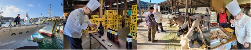 シェフ當間が九州の魅力あふれる食を求め、新鮮な食材が豊富な長崎へ赴きました。雲仙市橘湾でカタクチイワシを漁捕する「㈱天洋丸」では料理のアクセントとして使用する“エタリの塩辛”や“ニボサンバル”を紹介いただきました。また、醤油と味噌の造元「㈱山中商店」も訪問し、長崎の食材に合う手作りの醤油を吟味。安心安全な蒲鉾を作り続ける老舗蒲鉾店「長崎一番」や、他にはない自然な味わいと評判が高い牛乳を扱う佐世保市の「さとむら牧場」にも訪れ、生産者のみなさまと直にふれあいながら、食材を精選してまいりました。