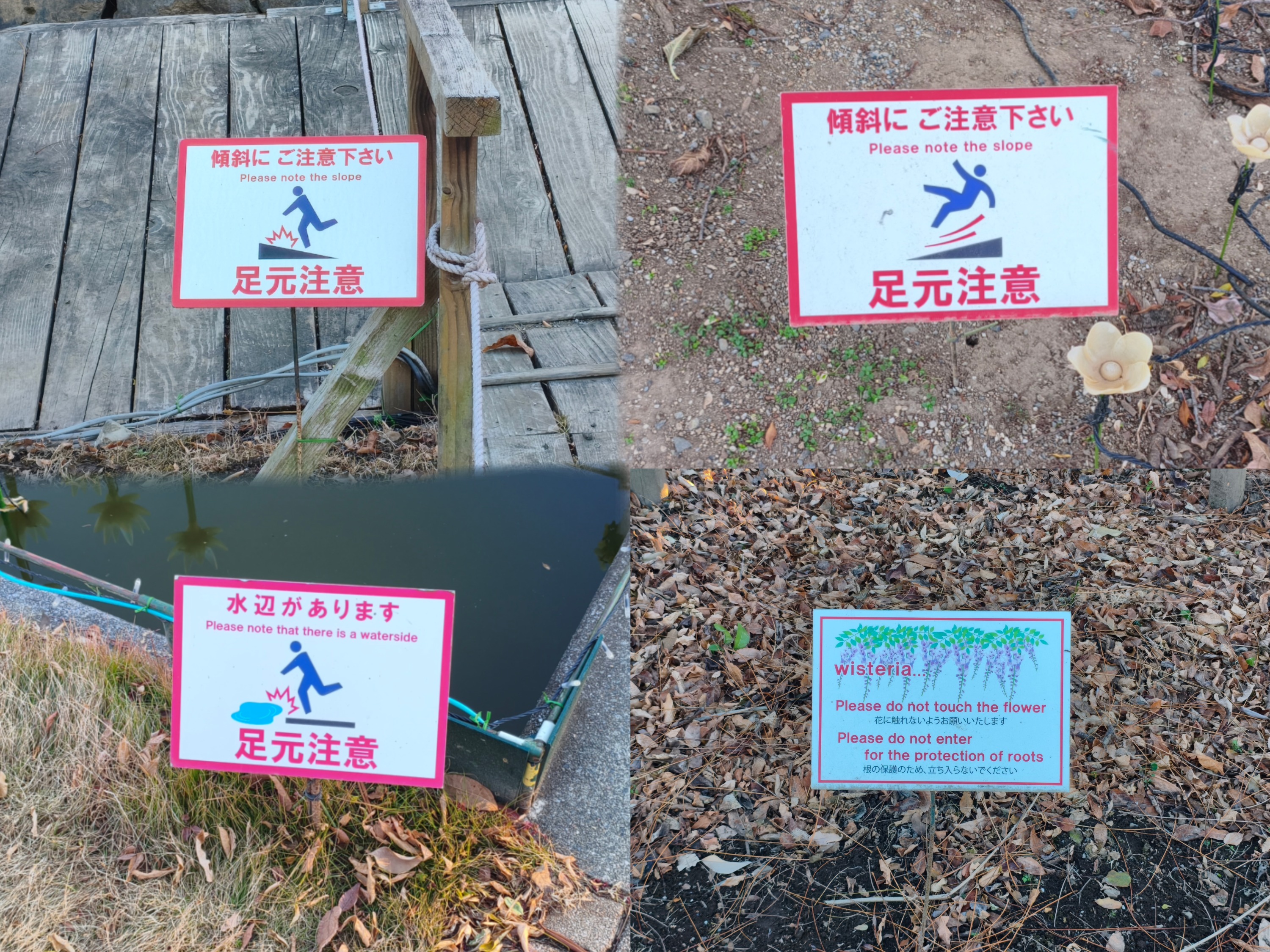 山の近くにある施設なので、どうしても斜面が急になってしまう場所や水辺がある場所には注意看板が立てられていて、安全にも配慮されていました。水辺の上に橋が架かっているような場所では、暗くなった時にも端がわかるようにライティングされていました。