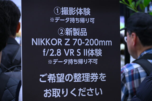 - NIKKOR Z 70-200mm f/2.8 VR S II: 発表されたばかりの最新「大三元」望遠ズーム。約998gというクラス最軽量の驚異的な軽さを実現し、旧型から大幅なシェイプアップを果たしました。三脚座のアルカスイス互換対応など実用面も細かくブラッシュアップされており、初日から体験整理券の配布がストップするほどの大混雑となっています。