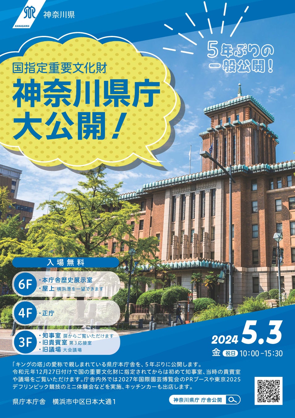 「キングの塔」の愛称で親しまれている神奈川県庁の本庁舎を5年ぶりに一般公開します。令和元年12月27日付けで国の重要文化財に指定されてから初めての公開で、本庁舎内の知事室、旧貴賓室や議場などをご覧いただけます。庁舎内外では2027年国際園芸博覧会のPRブースの展示や東京2025デフリンピック競技のミニ体験会などを実施し、キッチンカーも出店します。当日は、県庁周辺で、横浜開港記念みなと祭第72回ザよこはまパレード(国際仮装行列)も開催されますので、この機会にぜひ県庁にお越しください。