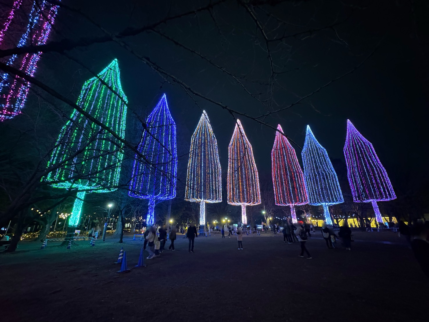 ゲートをくぐると、色とりどりの光が木々や通路を美しく照らし、幻想的な世界が広がっていました。光のトンネルや木々のライトアップなど、写真映えするスポットが多く、見ているだけで心が温まる空間でした。