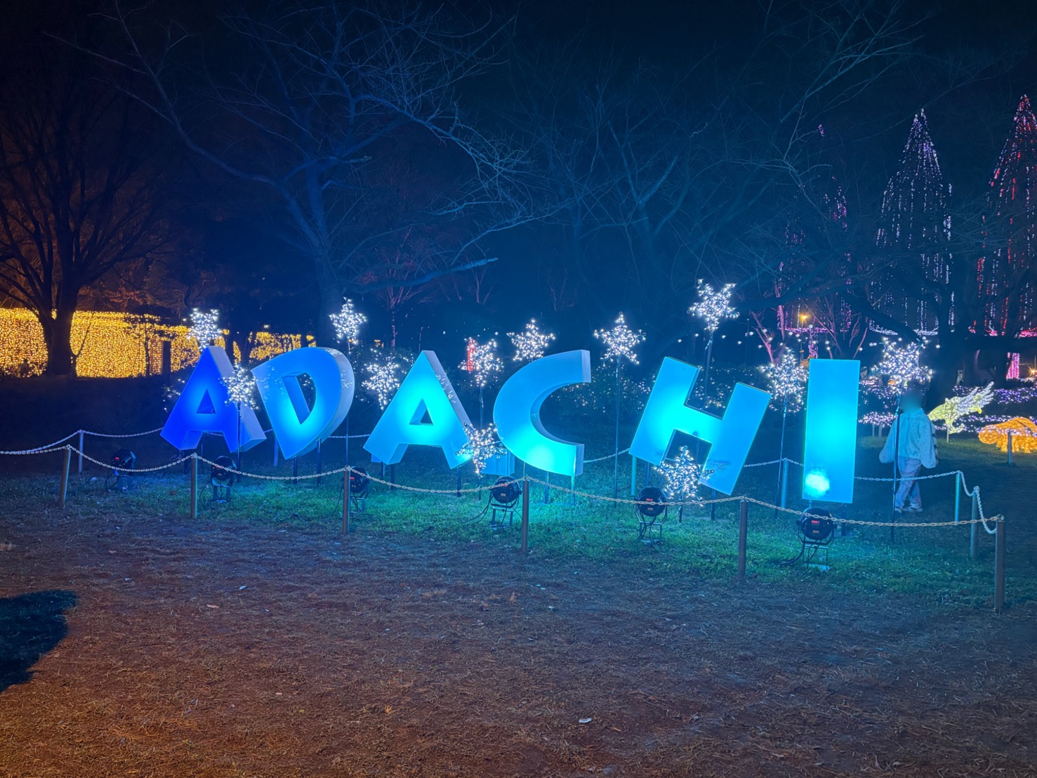 ゲートをくぐって進むと、イベントの場所である足立区の看板がライトアップされていました。このライトアップは時間で色が変化し、色とりどりでとてもきれいでした!!