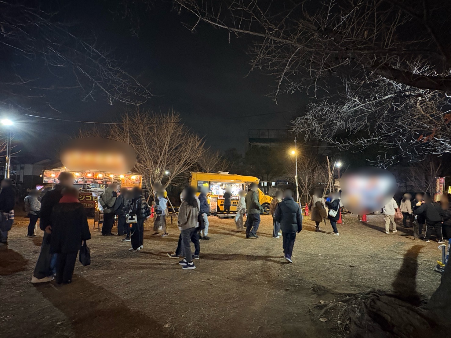 竹ノ塚駅からの通るルートで、徒歩15分ぐらいで到着しました。そして会場までの道は、木にイルミネーションが彩られていて、遠くからでもイベントの雰囲気が感じられ、自然と気持ちが高まりました!!