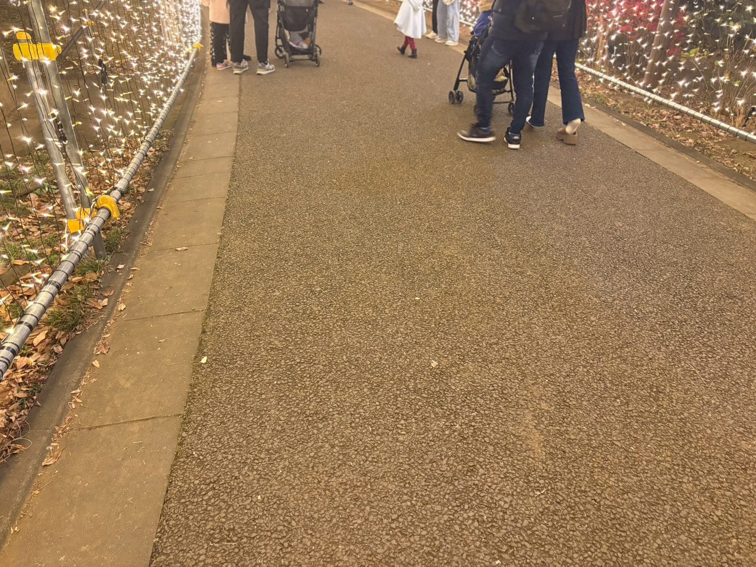 光の色彩は暖色系と寒色系がバランスよく組み合わされており、見る者に安らぎと高揚感の両方を与えていた。また、通路は広く段差がないため、車椅子やベビーカーでもスムーズに通れる設計になっています。実際にベビーカーを押している家族の方も問題なくイルミネーションを楽しんでいました!!