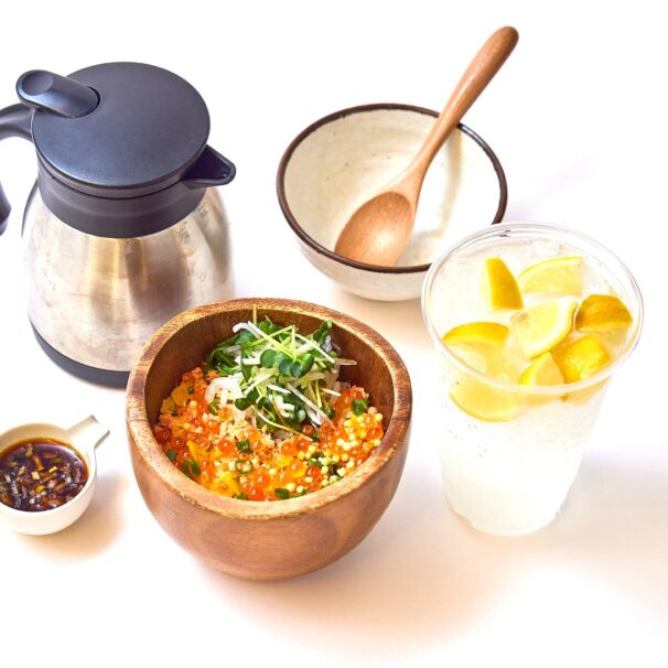 こめらく人気No.1のしゃけいくらで一杯。旨みと酸味の最強コンビ!最後は熱々のお茶漬けで〆る、至福のちょい呑みセット。