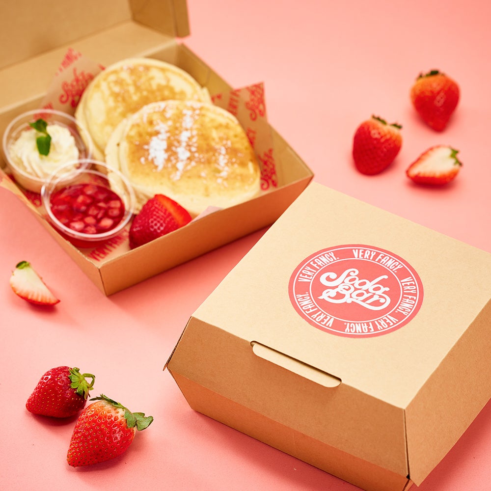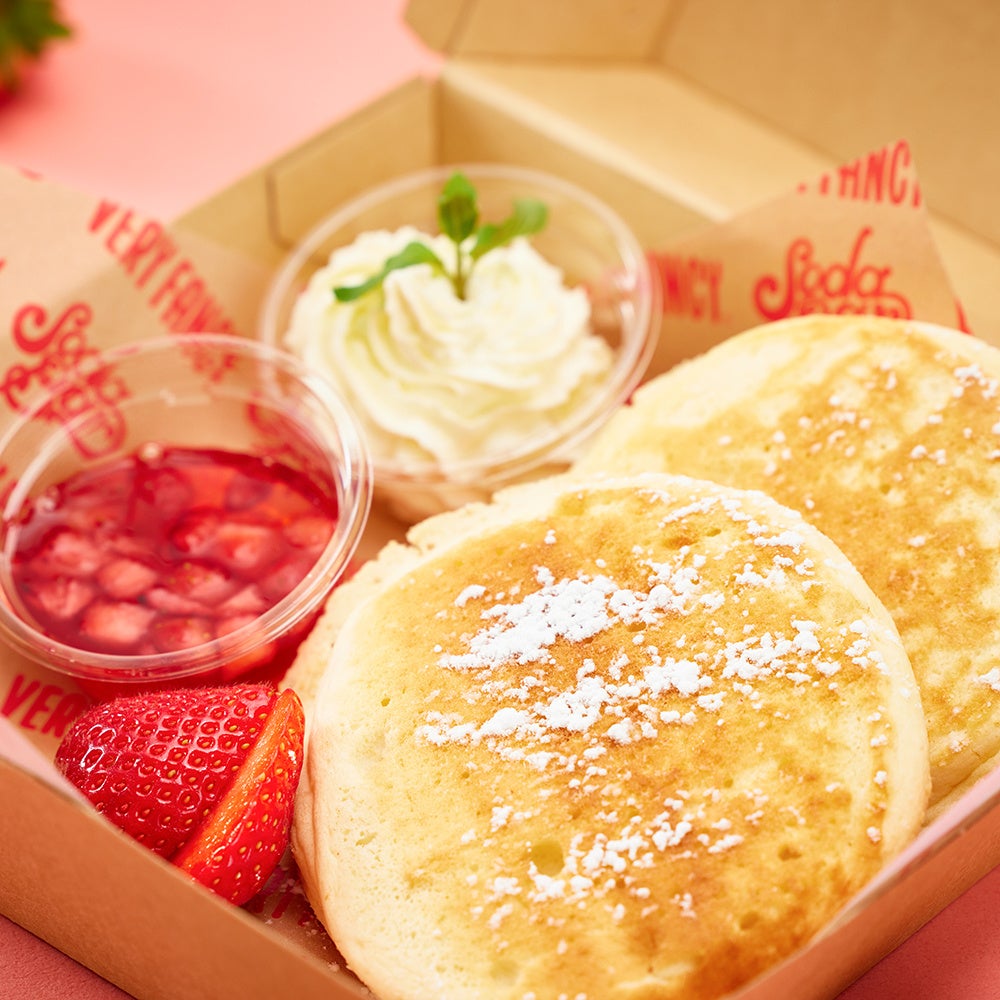 今回のコラボの為に特別に開発した VERY FANCY の特徴的な、“ふわっふわっ半熟” の新食感を活かしたオリジナル生地に、イチゴをじっくり煮詰めて作った SODA BARオリジナルソースと果実がアクセントになったイチゴソース、生クリームをトッピング。