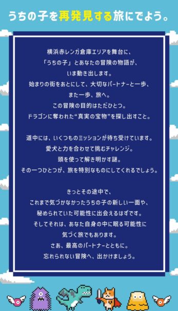 今回の「うちの子クエスト」では、横浜赤レンガ倉庫を舞台に[冒険の書]を携え、愛犬とドラゴンに奪われた“真実の宝”を取り戻す冒険のストーリーが展開されます。
