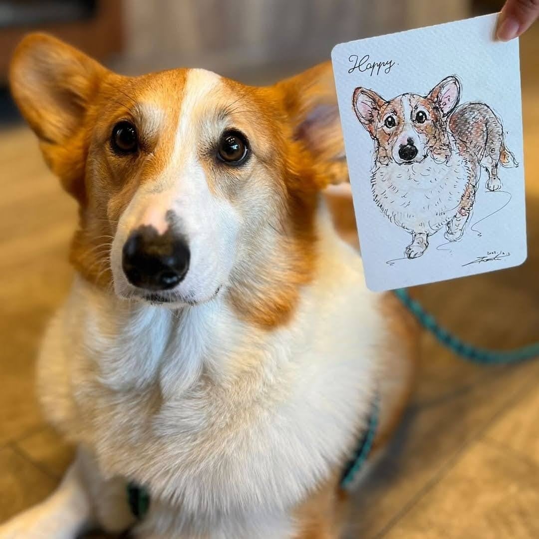 アートポラリスの『ライブドローイング』イベントは、うしすけとスターリーナイト田畑氏とのコラボ企画で15回目の開催となる企画です。アートポラリスは、アートを通してペット業界全体の活性化、並びにすべてのペットの幸せを願い活動しており、「絆を繋ぐオーダーメイド」をテーマに作品の制作をし、お客様とわんちゃんの忘れられない感動体験をお届けしております。『ライブドローイング』イベントは、愛犬の特徴を捉えた高いクオリティで注目されている大人気イベントで、お店にいらしてくれたわんちゃんや虹組のわんちゃんの写真をもとに、生き生きとした「愛犬の個性」を表現していきます。生命感に溢れた線とやわらかな色合いが絶妙にマッチした画風で、愛犬の「今日」の姿を似顔絵アートにのせて永遠に残すことができます。ドローイング後は、作品だけでなくメイキング映像も合わせてプレゼントいたします。また当日は、作成した絵から限定グッズもオーダーが可能となっております。